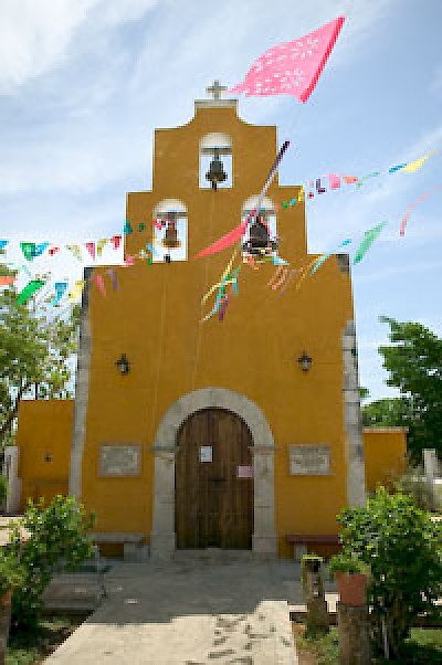 At one end of the dusty town square stands the Templo de Inmaculada Concepcion, a small yellow church, fluttering with colorful flags the day we were there, remnants of the recent fiesta. In the shade beneath some old trees on the side of the church we encountered a Mayan woman selling fruit and a Mayan boy selling pirated music CDs. And since this is Mexico, he was broadcasting his wares quite loudly through a make-shift public address system. As it turns out, this is the traditional place to do that. A beautiful little plaque on the wall next to the playground says that there used to be stones here that, when struck by a mallet, rang with a clear and unique tone. The locals would use the stones to call the community together. We asked the Mayan woman, Donde estan las piedras? (Where are the stones?). Robados! was her answer. Stolen. She couldn't tell us when, but the stones were taken awhile ago, and all that is left is a plaque. The plaque, which bears a date of 1977, says that the art of selecting and repairing stones that make these musical tones in perfect scale is a secret art known to certain citizens of this fair town and guarded carefully to stay within the town. One can only hope that even though the stones are gone, the art lives on in Dzitya.
