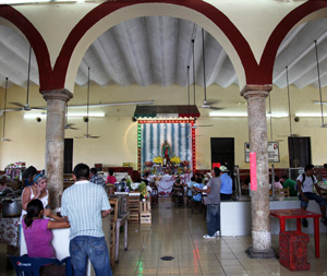 But you do not have to wait for December to enjoy your visit to Uman... there is much more to see! After a visit to the church and the market, you can just walk the streets during the day, enjoying the small town atmosphere. You might even come upon a gremio, like we did, and take the time to stop and watch the local residents parading their patron saint on his or her annual walk around town before they return him or her to their place in their church. You might take a moment to visit Evolución, one of Merida's two very active animal shelters. Evolución can always use an extra bag of dog food, a donation or a friendly pair of hands. If you are there at the right time of year, you might even participate in their annual Spay & Neuter Clinic for Uman, their effort to lower the stray population and the numbers of dogs and puppies dropped on their doorstep.