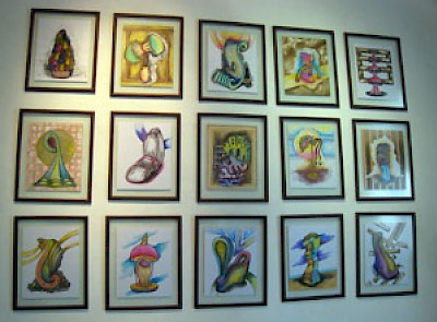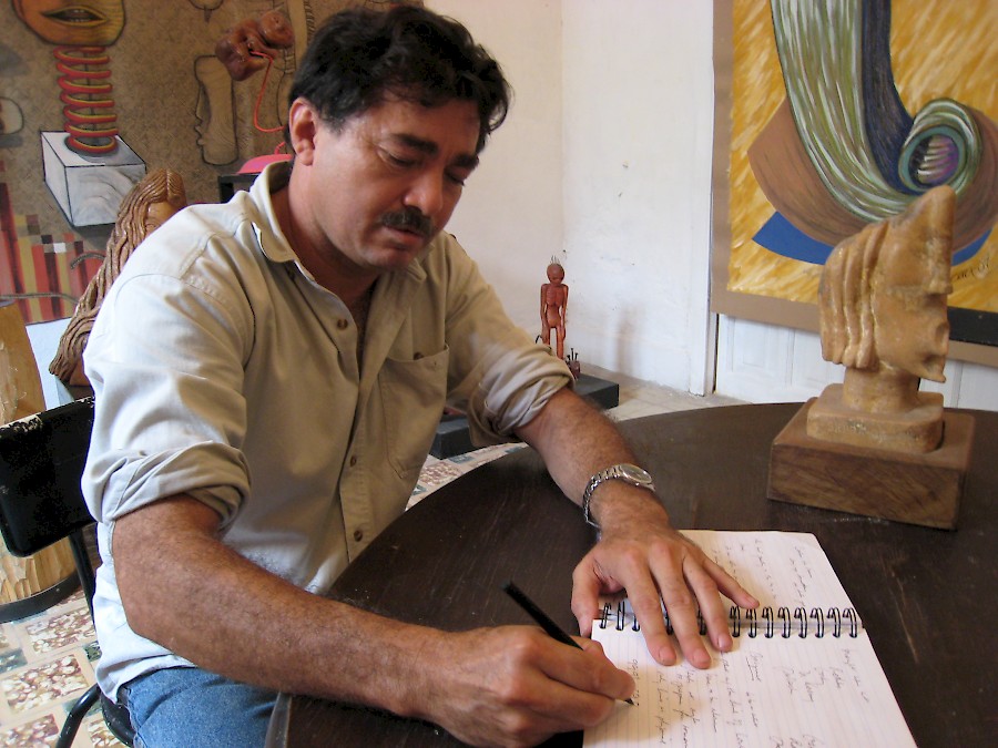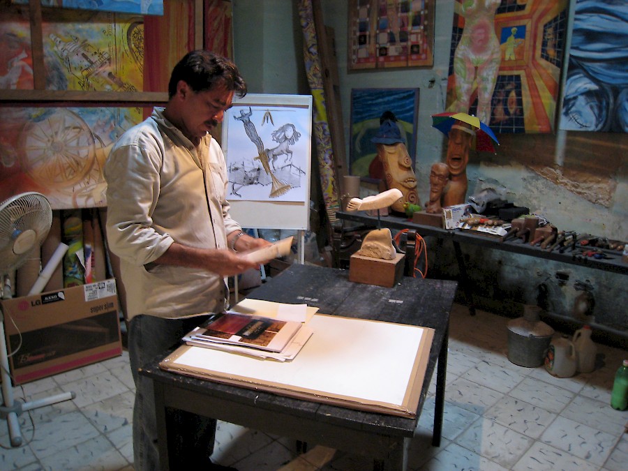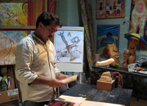 ¿Y cómo es el arte de David? Para responder a esa pregunta, fuimos a visitar su estudio. Su obra llena las cuatro habitaciones de su taller en el centro de Mérida, justo al este de la Plaza Grande. El exterior no llama la atención... solo otra casa colonial deteriorada. Pero por dentro, el edificio está lleno de color, desde los mosaicos del piso hasta la cima de las paredes altas, cubiertas de obras de David. Sus esculturas y libros de arte ocupan cada superficie horizontal. Hay óleos, dibujos, acuarelas, retratos, collages, esculturas de madera, objetos encontrados, esculturas de piedra. Si algo define a David Sierra es su impresionante producción artística: una profusión de formas, colores, tamaños y temas que habla de un alma inquieta y en constante búsqueda, con mucho que decir.