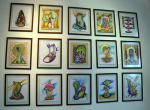 David nos mostró su serie más reciente, que ha titulado Contra la Guerra. Esta colección de más de 15 dibujos en tinta y acuarela son naturalezas muertas monocromáticas con imágenes bélicas transformadas para fines pacíficos. En uno de los dibujos, un revólver se convierte en pez. En otro (ver imagen a la izquierda), una mujer con cuerpo de caballo observa cómo una pistola engulle los pies de un prisionero encapuchado y un pez envuelve sus labios alrededor de una ballesta, todo frente a un muro que es angular y ondulante a la vez. Son imágenes impregnadas del surrealismo de la guerra, pero atravesadas por una belleza simple y algo anticuada. La yuxtaposición de ambos elementos crea un enigma hipnótico que nos hizo volver una y otra vez a mirarlas.