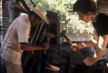Durante el día, Jeff observaba cómo Don Primitivo y su hermano alternaban golpes de martillo sobre metal incandescente que había sido calentado en un horno primitivo de ladrillo, mientras el hijo de Don Primitivo bombeaba las campanas para mantener el fuego caliente. Comenzaban con los resortes de hojas de coches viejos, y quemaban madera que recolectaban ellos mismos.