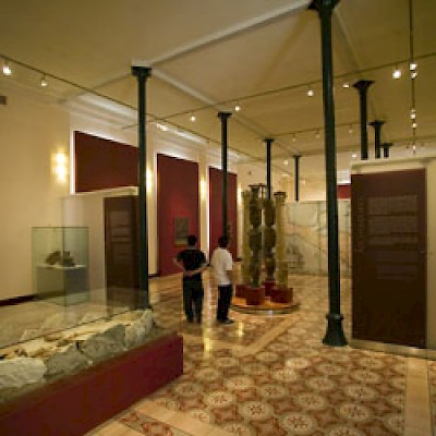 Al entrar por la puerta de cristal de enfrente, a pesar del constante flujo de visitantes a las nuevas exhibiciones, nos sorprendió encontrar nada menos que al director del museo, Orlando Vega Carrillo, parado tras la entrada para recibirnos. Hay cuatro cronistas oficiales de Mérida: historiadores, elegidos de por vida, cuya labor es investigar, redescubrir, registrar y proteger la historia de esta antigua ciudad. Don Orlando trabaja estrechamente con ellos en su labor como director. Debido a su profundo interés por la historia, prácticamente es un cronista por derecho propio. ¡Qué suerte! ¿Quién mejor para guiarnos que él?