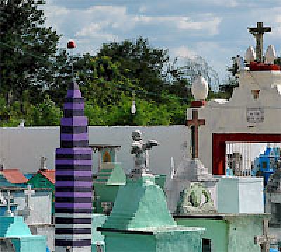 A visit to Hoctun makes a great weekend outing. If you go, be sure to visit the famous cemetery. The old section is fairly traditional, but the new section has some spectacular grave designs. There are several replicas of the Chichen Itza castle, painted all different colors and adorned with everything from flowers to cherubs and angels. There is also a 2.5 meter (or 8.2 ft) tall replica of the Latinamerican Tower in Mexico City. No crumbling cemetery here. Everything is beautifully painted, every year, and worthy of being a tourist destination all its own. You'll want to see the church too. There you will find the Black Christ of the Transfiguration, San Miguel, and the Virgin Mary. We'd like to mention that Ginny (Peregrina), one of our regular visitors, is from Hoctun and no, the Working Gringos did NOT make it to the Vaquería that was held there last weekend. We hope she'll forgive us and we'll try to make it next year or just drop by soon to visit her beautiful little town.
