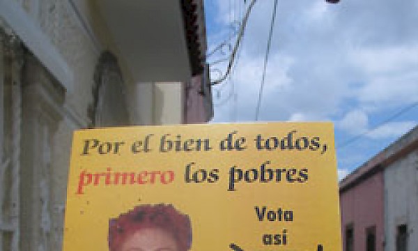 This morning, we woke up early to take the dogs for a walk. We were surprised to find the park outside of El Gran Cafe crawling with luz y sonido stage techs setting up for a big rally with more political posters than we've ever seen in one place...