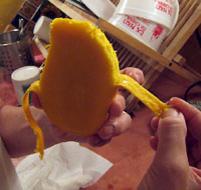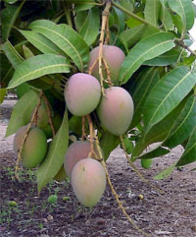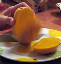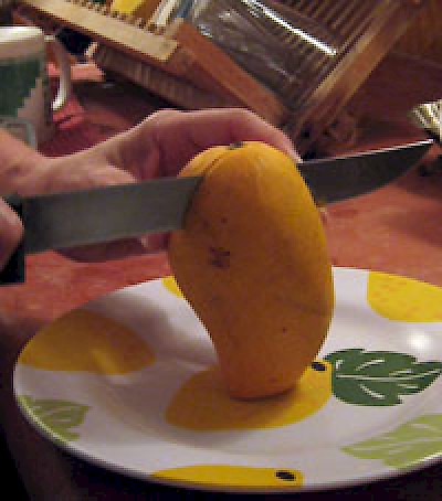 Hold the end of the mango that was previously attached to the tree towards you. With a sharp knife, slice into the fruit with the knife parallel to your body and cut straight down. Repeat on the other side. What you have now done is cut off the two 'rumps' or nalgas of the mango (is there any doubt that mango-eating is a sensuous experience?). The center part contains the semilla (seed). Start eating your mango by holding each plump little nalga in your hand, and spooning the mango out like you might a dish of ice cream or a half of an avocado. A ripe mango will just lay still and submissive as you spoon its tender flesh into your mouth with an ease we had not previously thought possible. After devouring the nalgas, pick up the half-naked semilla, peel off the skin on either side, and hold it at its base as you nibble the remaining flesh clinging to the large hard seed. (This part of eating a mango is sponsored by the Dental Floss Lobby.) When you have nibbled it from top to bottom, just toss it onto the plate...you are done!