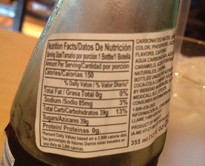While we awaited our food, we enjoyed a bowl of totopos, served with a roasted tomato salsa. We took possession of a big glass of horchata that tasted just like abuelita used to make and a Mexican Coke in a bottle (we got our choice... lata o botella?). Because we are in the USA, our Mexican coke came with a label. Now we finally know that a bottle of Coke has 150 calories and 38 grams of sugar. Good to know, sort of. Did we really want to know?