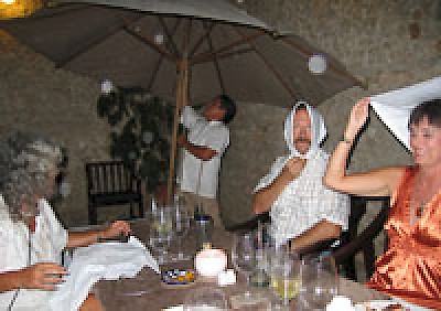 When dinner was ready, we moved the party to the patio in the back of the garden where a table had been set up for us. We were in our own private open space, with the stars above, surrounded by old stone walls, sitting in comfortable chairs and enjoying each other's company. The service was impeccable as several waiters served a lovely chardonnay and a delicious dinner.