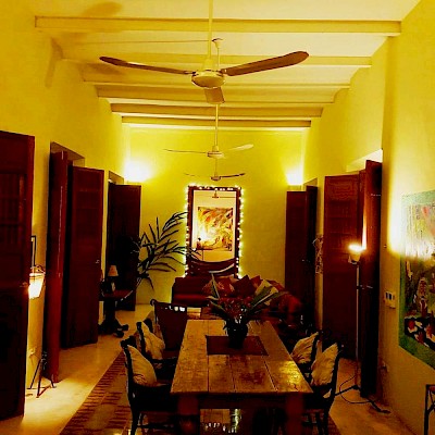 The property is well shaded with huge royal palm trees, tall timber bamboo and tall trees. The old stone house itself is filled with colonial style double doorways which, when open, provide excellent natural airflow, such that air conditioning is not a necessity. Inside the house, ceiling fans provide adequate air movement and work well with the warm and humid climate of the Yucatan. However, the house is prepared throughout, for the easy installation of air conditioning units wherever the homeowner might feel it is needed.