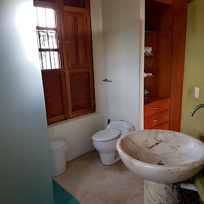 The house is partially set back from the street providing a wonderful private front garden and entry. A gated driveway on the west side of the property allows entry to a 3 car garage at the rear of the property. The back garden is primarily occupied by a 4m x 12m, partially covered, deep pool. A bedroom and bath, and a bodega, are located on the east side of the pool. A stairway on the east side leads to the upper terrace area that allows access to a smaller stairway that leads up to a rear entry to the upper bedroom on the second floor. Also on that entry platform is a spiral stairway that leads further up, to the upper roof area allowing access to a 50 gallon solar water heating system and an 1,100 liter tinaco (water tank) that supplies water, and good gravity water pressure to the house. The Tinaco is fed via a submersible water pump located in a 1200 liter cistern on the ground level, under the patio. The cistern is fed via a 500 liter lower tinaco on the west wall of the property that receives city water. In addition, there is a wastewater well, and a deep freshwater well that provides service to the pool and garden (front and back) watering system.