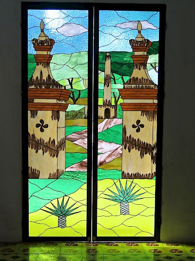 Puzzled, but tired after stomping all over the hacienda and taking the museum tour, we decided to have a cold beverage and light lunch at the hotel. As I was sipping, well, more like guzzling, a frosty Dos Equis, I glanced at two stunning pieces of stained glass features displayed in the dining room. One represented Empress Carlota’s visit to Uxmal. The other was a representation of Don Lorenzo de Evia’s original gateposts with those mysterious symbols. Why were they placed on the gateposts? We asked the waiters and they did not know.