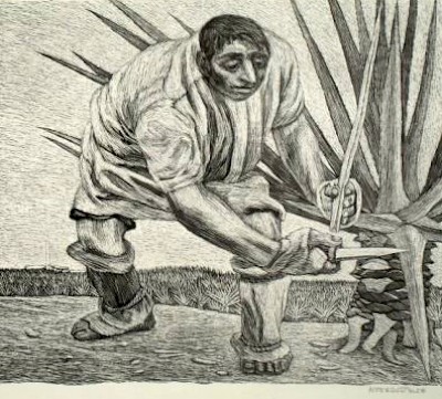 One of every three Mayas in Yucatan is a slave, hostage of henequén, and their children, who inherit their debts, will be slaves too. Lands are sold complete with Indians, but the great henequén plantations use scientific methods and modern machinery, receive orders by telegraph and are financed by New York banks. Steam-driven scraping machines separate the fibers; and International Harvester trains run them to a port called Progress. Meanwhile guards shut the Indians into barracks when night falls, and at dawn mount horses to herd them back to the rows of spiny plants.