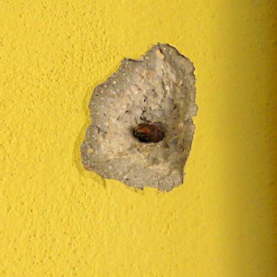 We had two or three batches of cement that were mixed with polvo (dust or fine dirt) containing a plant seed capable of germination long after the cement had dried. In some cases the seed would germinate after a full month and produce a bullet-hole type of mark in the wall. The only solution turned out to be to patch it and paint over it.