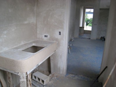 The conventional way to build a concrete counter here is to build a form out of wood, lay in iron reinforcement, which is smallish rebar and wire mesh, and then pour concrete into the mold. The concrete is plastered over with a layer of smooth, white cement, often with a colored pigment added. The last touch is to polish the final coat to a nice luster.