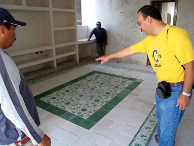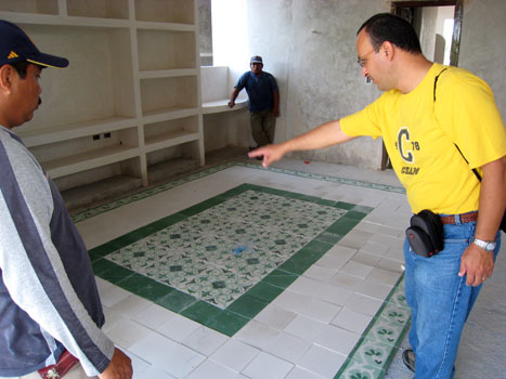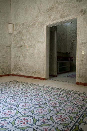 As mentioned before, many of the rooms are not perfectly square, but the tiles are. In some cases, if you lay tiles all the way to the wall, they must be cut at an angle that is obvious and somewhat disconcerting. A traditional way to mask this problem is to lay a square tapete, or carpet, of tiles in the center of the room and fill the space between it and the walls with polished white cement. This is exactly what we have done in most of our rooms.