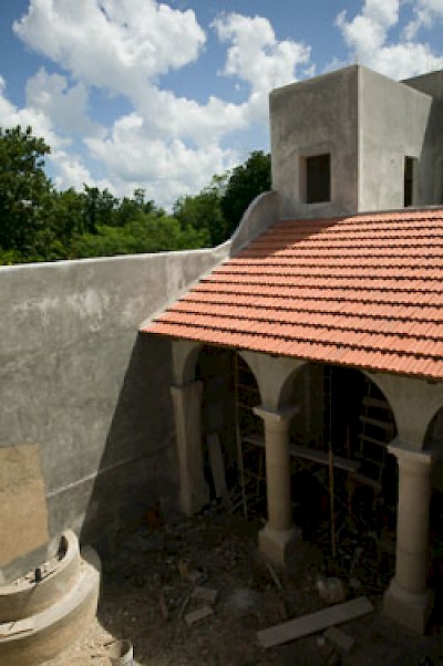 The tejeban over the courtyard terrace is supported by concrete columns and arches, but the upstairs terrace floor could not support this kind of structure. The architects had to devise a way to support the rather wide tejeban somehow, which they managed to do by using a long steel girder that extends from one load-bearing wall to another, a distance of about 30 feet. The girder itself weighs several tons and we were curious how the masons would lift it to the second floor and set it on the walls. The architects were curious about it, too. Nobody offered a solution. For three days the girder lay in the yard while we discussed other matters with the architects. Then one day we all arrived to discover that the girder was installed high on the walls of the second story, without any explanation by the masons. Our curiosity has not been satisfied and we remain puzzled. We are reminded of the Maya legend about the technique the ancients used for lifting the massive stones to build their temples: levitation.