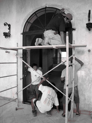 Our architects hired two different iron workers to work on our house. The doors upstairs facing the patio with the outdoor bathtub were done by one man, who did a markedly sloppier job than the other iron worker. His doors didn't seem quite as well put together, and when he installed his work, he made a lot of unnecessary holes in the walls. Upon observing that, our architects repaired the damage and gave the rest of the doors and windows to the second iron worker. His work has been neat, careful and consistent. In the past two months, he has built and installed bannisters for the inside staircase, the divider between the living and dining rooms and for the stairs next to the pool. He's also built the three arched iron doors leading into the kitchen and dining rooms, as well as the rectangular-paneled doors for the living room and master bedroom, which