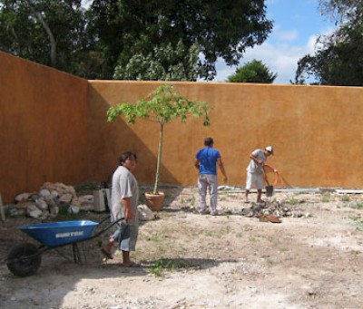 The same day, we also planted our first tree. A ceiba tree (which was given to us by our friend Lucy from Selva y Jardin) was planted carefully, far enough away from the wall so it can grow for twenty or thirty years (or more!) without damaging it. Working Gringo sprinkled a few drops of ceremonial Coca Cola on the ground, and we welcomed the tree to her new home. A few volunteer native palms that were hardy enough to have survived the last six months of abañile basura being thrown on them were also dug up and replanted along the wall. It has been many months of rock, tile, dirt and dust, so it was a real pleasure to see a few spots of green going into the back yard.