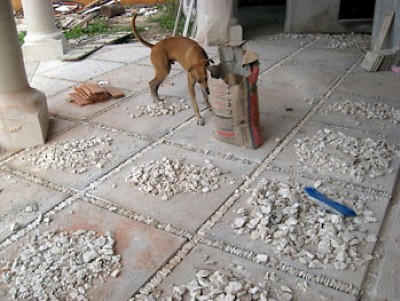 A lot of work has been done on the floors in the past two months. The long pasillo which reaches from the front of the house in the garage to the back of the property, has been floored with diamond-shaped areas of grey cement, separated by rows of white chipped stone, called rajuela. Rajuela can be any color; the term refers to the style of placing chipped stones side by side. We ended up using rajuela for the pasillo floor, for the water wall that is the focal point of the swimming pool, and as the backdrop for our Virgen de Guadalupe statue that graces the courtyard fountain. (We found our Virgen on the road from Tulum to Valladolid. It was created by the men who have a roadside store set up at about 15 km inland from Tulum.) The work of creating rajuela is tedious, as the large stones must first be chipped into small pieces, and then painstakingly set into place. The result is beautiful, but we pity the workers who have been doing those rajuela lines in the floor for what must seem like centuries now! Our plain grey cement floors look beautiful with the rajuela delineating the diamond shapes, and they rhyme with the diamond layout of the saltillo tiles in our patio and next to the pool... an unintended but very harmonious effect, if we do say so ourselves.