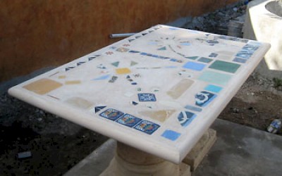 After all the tile work had been completed, which included Talavera tiles in kitchens and bathrooms, and mosaico tiles on most floors (in combination with white cement), we took the leftover pieces and created a cement potting table in the back area behind the pool. Hidden from view, this table also takes advantage of unused column pedestals for its base. With the big garden and all the outdoor terraces this house has, we think we're going to put this table and this area to good use.