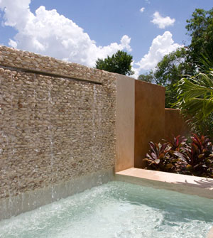 We built a water-wall fountain at the end of the pool for aesthetic purposes. It turns out this fountain, which draws water from the pool, pumps it up and then drops it back into the pool, allows us to circulate the water (and chemicals) even more quickly through the pool. It turns out the top of the water wall, which has about one inch of water in it even when the pump isn't running, is also the neighborhood's most popular birdbath. Who knew how much enjoyment we would get out of lying around in the pool, watching the local xcav birds (those noisy black grackles you see everywhere here) and mourning doves splashing and carrying on in their own private spa? It turns out the water wall, besides looking particularly beautiful at night when the water sparkles as it falls down the rajuela (stone chips) wall in the light, also gives off the perfect white noise to cover up any neighborhood noise that we may not want to hear. The pool is a blessing in the heat, and the water-wall fountain completes the picture.