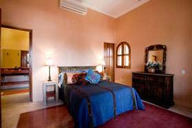 1 bedroom with two full beds adjoining the shared bath, opening onto the portico and the garden.