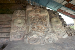 Archaeologists believe this and many of the other 400 Mayan structures of Acanceh were initially built during the early classic period, roughly 200-300 years A.D. and then elaborated through the late classic, around 1,100 A.D. The structure on the main plaza is usually called "The Pyramid". A climb to the top is rewarded in two ways. The first is a lovely view of Acanceh, including some of the other Mayan structures and the surrounding jungle. The second is a series of five "masks", which are large bas-relief sculptures made of stone and covered in stucco. These are currently protected from the elements by modern, corrugated fiberglass shelters, which also protect the visitor from the heat of the day. A bit farther to the south, you'll find the "Pyramid of the Stuccos", which also has bas-relief sculptures, these depicting human-like animal forms. Most still wear some of the bright pigments with which these ceremonial centers were originally painted.