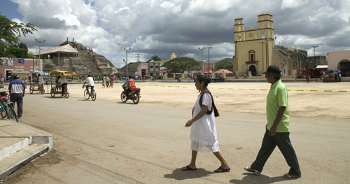 Acanceh was an important destination between Mayapan, the last of the great city states in Yucatan, and T'ho (now called Merida). With the decline of the Toltec influence from the west and resulting civil wars between the city states, the Maya began to spread out and develop many smaller, self-contained villages based on agriculture and trade. While many of the former city states were maintained as ceremonial centers and pilgrimage destinations, they were no longer the center of Maya daily life. When the Spanish arrived, they soon recognized the situation. They co-opted the Maya caciques (chiefs) and built churches at the Maya ceremonial centers using stone retrieved from the pyramids. For this reason, most of the important colonial towns and cities of Yucatan show few traces of Mayan architecture, two notable exceptions being Izamal and Acanceh.